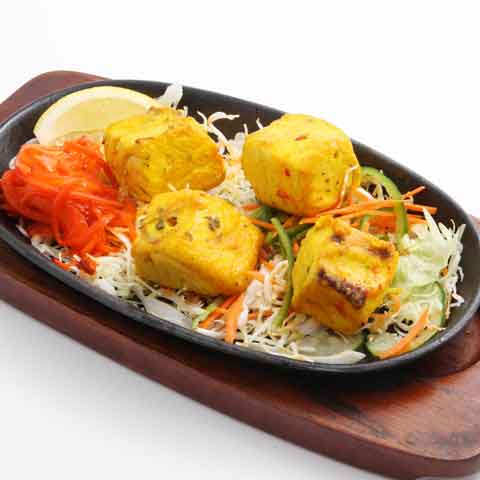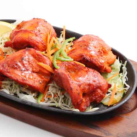 骨なしの鶏肉をスパイシーなヨーグルトソースに漬け込んで炭火焼き